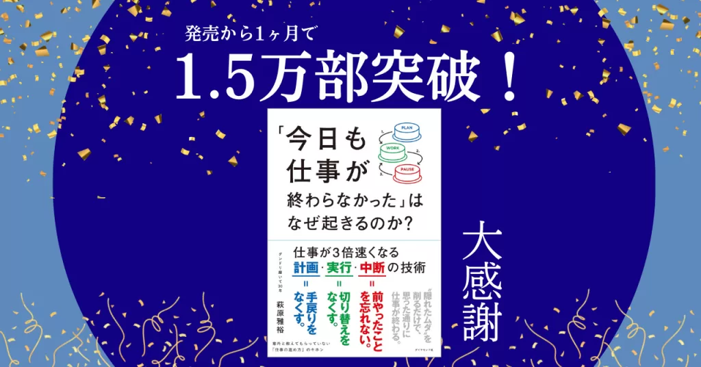 Prodotto合同会社(本社:東京都渋谷区)代表:萩原雅裕による著書『「今日も仕事が終わらなかった」はなぜ起きるのか?仕事が3倍速くなる計画・実行・中断の技術』が発売1ヶ月で3刷1.5万部を突破いたしました。
